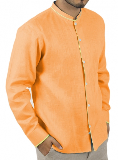 Camisa de Lino 100% color naranja, cuello estilo mao, detalles en las mangas, cuello y muñecas color amarillo. Diseñada para dar un estilo casual para los hombres sin perder la elegancia.