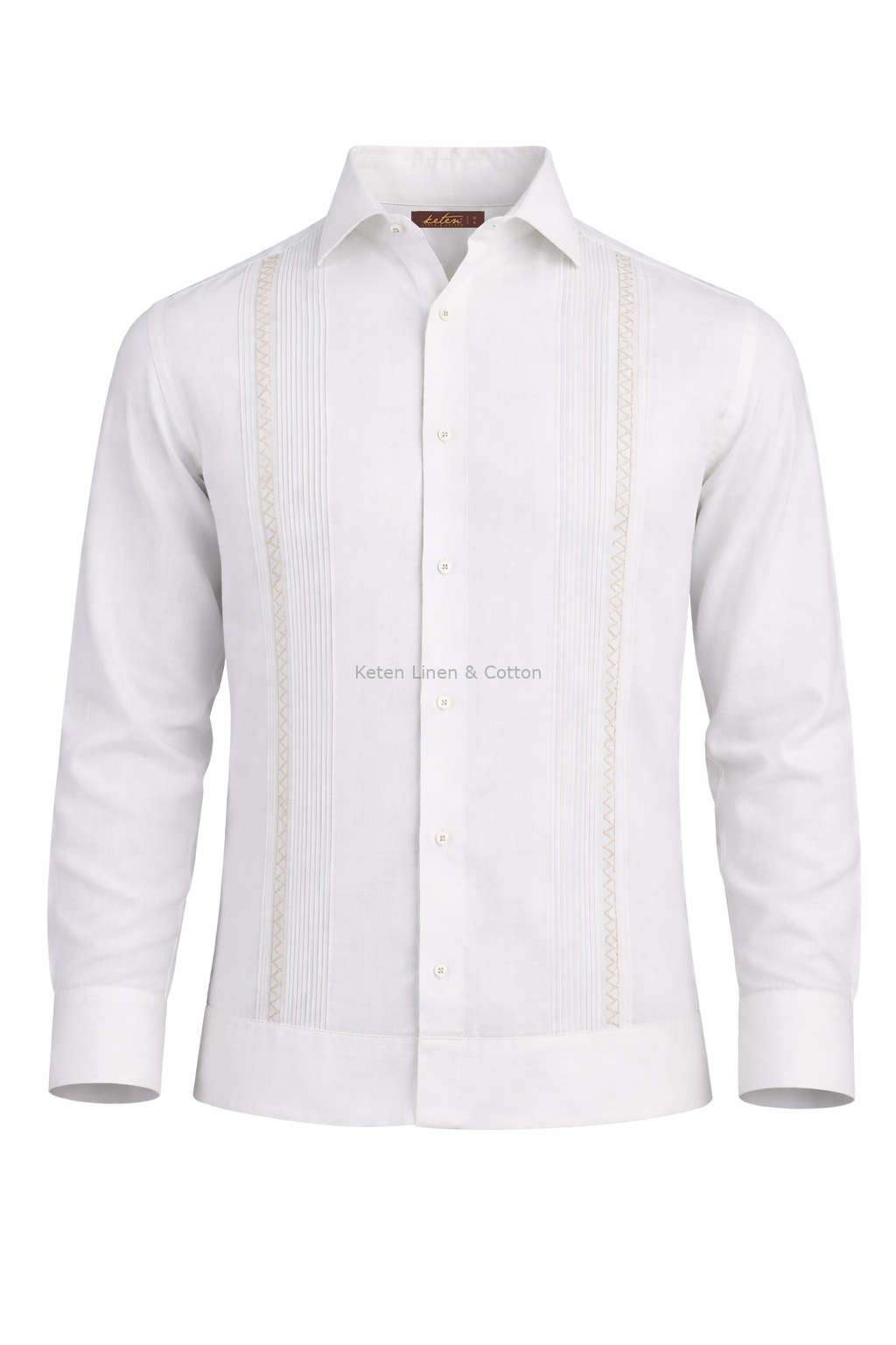 Guayabera de Lino Flame Bordada Manga Larga con alforzas al frente y en la espalda. Hecho con Lino Flame (Algodon con Poliester) de lo mas alta calidad. El bordado es a maquina con hecho a mano. No se utiliza computadora.